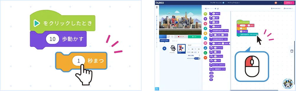 図形やイラストを組み合わせて「視覚的」にプログラミングの基礎・概念を学びます。