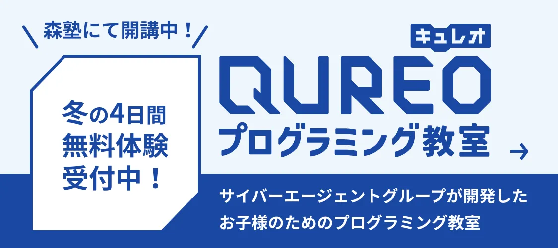 「QUREO(キュレオ)プログラミング教室」は、一人ひとりのレベルや進度に合わせて楽しく学べるプログラミング教室です。